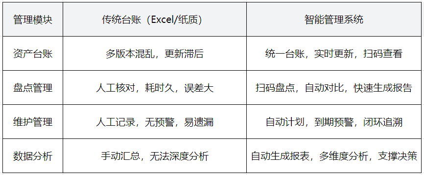 保守台账(Excel/纸质)正在资产数量少、办理需求简单的阶段尚可应对,但跟着企业规模扩大、资产类型增加,其短板逐步凸显,成为办理效率的“绊脚石”。