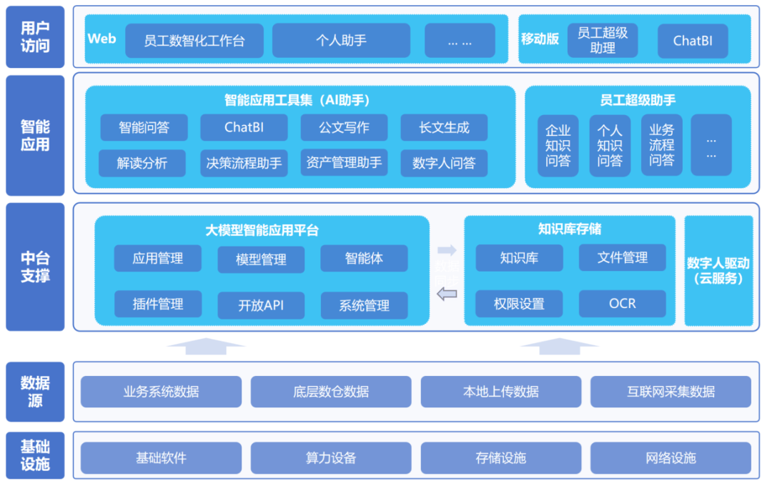 正在数字化转型海潮中,国度、国务院及市,别离出台“人工智能+”相关政策,要求抓住人工智能大模子手艺改革机缘,特别是国有企业要加速数字化转型程序,加速人工智能手艺正在财产中的使用,提拔国有企业的立异能力和焦点合作力。集智将来人工智能财产立异无限公司(以下简称“集智将来”)做为国有企业的一员,肩负“手艺立异引领者”取“财产变化鞭策者”的双沉,正在数字化阶段,公司的扶植已初具成效,但正在智能化阶段,存正在现无数据分离,现无数据无法支持AI使用、内部学问无法共享、贫乏个性化AI东西及数据平安等营业现状,正在充实阐发企业营业成长示状后,结合深耕数据及模子智能相关手艺的开普云消息科技无限公司(以下简称“开普云”),借帮以人工智能手艺为代表的新质出产力,扶植基于新质出产力的企业数字化转型平台,提拔员工效率和质量,引领行业立异,鞭策国有企业智能化转型。·客户需求:针对员工正在日常办公中面对大量公函撰写、长篇文档处置、营业征询取问答等反复性工做,操纵大模子能力为日常办公高频场景供给智能辅帮,提拔日常办公效率。·处理方案:开普云基于自研的开悟智能体平台供给的多模子集成能力、夹杂检索加强引擎以及智能体可视化编排组件,通过内置Qwen系列、DeepSeek系列等多块大模子,搭建企业专属学问库,开辟扶植合适客户实正在场景需求的智能问答、公函写做、长文生成、解读阐发等智能化通用办公东西调集,办事客户全体员工,辅帮提拔日常办公效能。·客户需求:聚焦客户内部计谋征询、资产办理等存正在大量数据收集、检索及梳理清点的场景,扶植笼盖从数据采集、管理到内容生成的全过程AI帮手,为焦点营业部分供给个性化智能帮手办事。·处理方案:开普云连系本身互联网多渠道大数据采集管理能力取AI Agent中台能力,整合客户多渠道互联网数据来历进行一坐式从动化数据采集,并基于开悟智能体平台自带数据清洗取学问库建立能力,为客户定制开辟和研帮手、资产办理帮手等个性化智能帮手,大幅提拔相关营业部分工做效能取质量。·客户需求:客户正在企业运营决策中,面对数据查询依赖手艺人员、多源数据整合难、目标阐发不及时的痛点,亟需建立可对接底层数仓,建立天然言语问数的智能数据底座,实现运营数据的快速检索取深度阐发。·处理方案:开普云针对客户数据驱动办理决策需求,通过度析客户数据资产现状、日据阐发场景及带领办理决策需求,将客户泛化需求为布局化问数(ChatBI)的模块化能力,通过建立语义目标系统、企图识别系统、天然言语转SQL办事、数据可视化、归因阐发和数据预测共6部门需求,对接客户现无数仓中600+数据资产目次、2000+张数据表,为客户供给基于天然言语对话式问数、查数、数据阐发及演讲生成办事,提高客户科学决策程度。·客户需求:正在跨部分协同中,存正在学问共享难、使命办理分离、流程驱动慢等痛点,期望将大模子能力取现有协同办公系统对接,实现企业内部学问共享、智能倡议工做使命、流程智能驱动等功能,削减消息壁垒、降低内部营业流转耗时。·处理方案:开普云基于开悟智能体平台供给的尺度API能力,取客户协同办公系统深度集成,打通企业学问、营业流程、工做使命等焦点模块,通过嵌入式员工超等帮理,将AI能力融入客户已有协同办公系统,供给学问问答、使命倡议、流程驱动等智能化办事,大幅提拔客户内部营业协同效率。无专属AI算力资本,且未搭建同一的算力底座,无法支持大模子的当地化摆设取高效运算。同时,前期仅零星接入通义千问V1。0单一模子,无尺度化的模子办理系统,存正在多模子兼容适配难、模子挪用响应慢、分歧营业场景模子能力不婚配等问题。企业数据做为焦点计谋资产,分离于人力资本、法务、财政等多个营业系统,导致学问共享效率低下、检索精准度不脚,统计数据从预备到呈现周期冗长,严沉影响决策效率。特别做为国企,面对数据平安取价值挖掘的两难窘境:现有系统缺乏分级权限机制,接入公有大模子存正在泄露风险,而扶植私有化数据基座需处理多系统同步、涉密数据隔离取全链逃溯等复杂问题。大模子对保守组织架构构成显著冲击。企业内部部分间存正在较着的营业取数据壁垒,营业部分、手艺部分及办理层等分歧层级对AI的认知差别较大,企业内部组织缺乏跨部分协调机制,导致需求对接周期长、消息传送失实,AI能力取营业需求脱节。别的,因为AI能力的接入,企业内部也需要考虑新模式下组织形成、营业流程等沉建带来的潜正在影响。通用大模子难以间接婚配特定营业逻辑,而保守使用架构缺乏针对国企营业的定制能力。环节挑和正在于若何正在同一智能中台根本上,实现通用能力+场景化定制的均衡,避免为单一场景反复投入。这要求深切理解营业素质,将行业学问取AI手艺深度融合,成立可复用的场景适配框架,使大模子既能连结通用能力劣势,又能精准处理具体营业痛点,实正实现手艺价值向营业价值的无效。坐正在国度数字化转型取国企智能化升级的宏不雅高度,本项目旨正在建立一个以人工智能为驱动的现代化企业管理新范式。其底子价值不只正在于提拔日常办公效率,更正在于通过智能手艺沉构企业学问系统、决策机制取协同模式,实现从经验驱动向数据取学问双轮驱动的